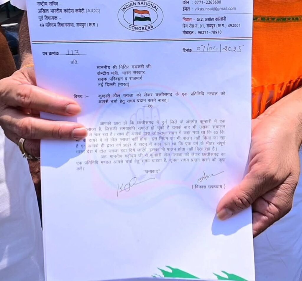 रायपुर। रायपुर पश्चिम के पूर्व विधायक विकास उपाध्याय ने आज एक गंभीर जनहित मुद्दे को लेकर केंद्रीय सड़क परिवहन एवं राजमार्ग मंत्री नितिन गडकरी को पत्र लिखा है। अपने पत्र में श्री उपाध्याय ने कुम्हारी टोल प्लाज़ा में हो रही कथित अवैध वसूली को लेकर कड़ी आपत्ति जताई है और इसे जनता के साथ सीधा अन्याय बताया है।