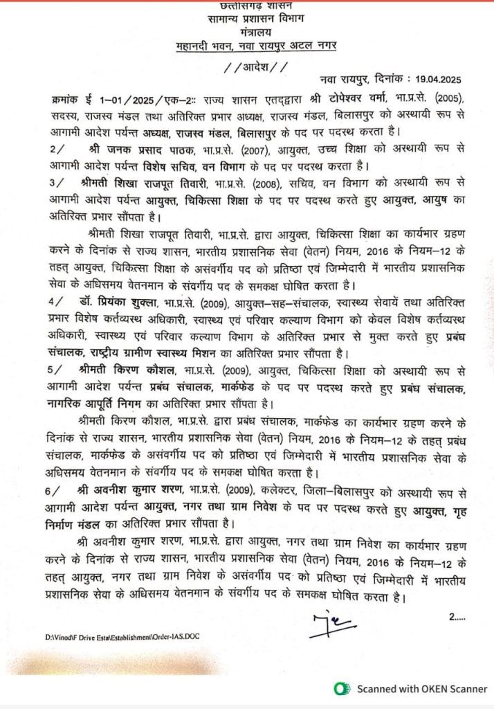नया रायपुर, 19 अप्रैल 2025। छत्तीसगढ़ शासन के सामान्य प्रशासन विभाग द्वारा शुक्रवार को एक बड़ा प्रशासनिक फेरबदल किया गया। इस आदेश के तहत राज्य सरकार ने 27 भारतीय प्रशासनिक सेवा (IAS) अधिकारियों के कार्यस्थलों में बदलाव करते हुए उन्हें नई जिम्मेदारियाँ सौंपी हैं। इन तबादलों में कलेक्टर, सचिव, संचालक और आयुक्त स्तर के अधिकारी शामिल हैं।