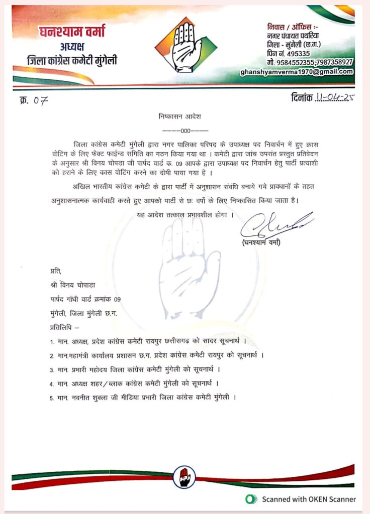 अखिल भारतीय राष्ट्रीय कांग्रेस द्वारा हाल ही में दिल्ली में आयोजित जिलाध्यक्षों के अधिवेशन के ठीक बाद मुंगेली जिला कांग्रेस कमेटी में एक बड़ा राजनीतिक घटनाक्रम सामने आया है। कांग्रेस जिलाध्यक्ष श्री घनश्याम वर्मा ने नगर पालिका परिषद उपाध्यक्ष चुनाव में क्रॉस वोटिंग के मामले को गंभीरता से लेते हुए गांधी वार्ड के एक कांग्रेस पार्षद को 6 वर्षों के लिए पार्टी से निष्कासित कर दिया है।
