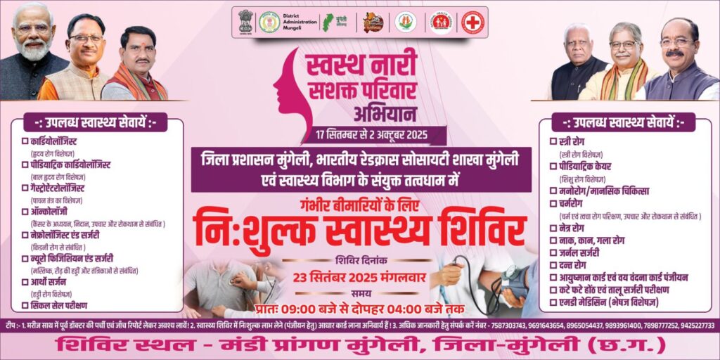 मुंगेली। भारत सरकार के स्वास्थ्य मंत्रालय द्वारा 17 सितम्बर से 02 अक्टूबर तक संचालित ‘स्वस्थ नारी, सशक्त परिवार अभियान’ के अंतर्गत मुंगेली जिले में भी विविध जनहितैषी कार्यक्रम आयोजित किए जा रहे हैं। इसी कड़ी में 23 सितम्बर, दिन मंगलवार को जिला प्रशासन, स्वास्थ्य विभाग एवं रेडक्रॉस सोसायटी के संयुक्त तत्वावधान में स्थानीय मंडी प्रांगण में निशुल्क मेगा स्वास्थ्य शिविर का आयोजन होगा।