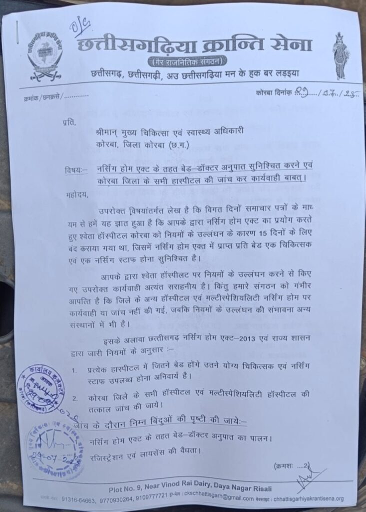 कोरबा।(पुरूषोतम सीदार) जिले में संचालित शासकीय और निजी अस्पतालों में नर्सिंग होम एक्ट 2013 के नियमों के उल्लंघन को लेकर छत्तीसगढ़िया क्रान्ति सेना ने कोरबा जिला प्रशासन को ज्ञापन सौंपते हुए समस्त अस्पतालों की जांच और कार्रवाई की मांग की है। संगठन ने चेतावनी दी है कि यदि शीघ्र कार्रवाई नहीं की गई तो जन आंदोलन किया जाएगा।