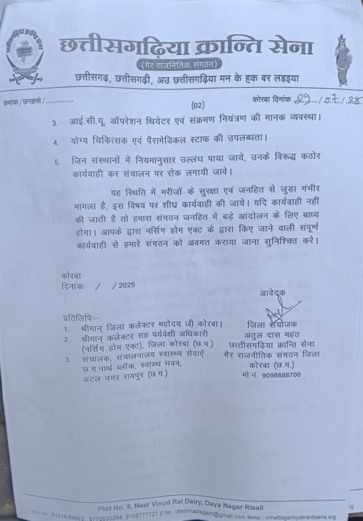 ज्ञात हो कि पूर्व में नर्सिंग होम एक्ट के नियमों के उल्लंघन पर कोरबा कलेक्टर द्वारा श्वेता नर्सिंग होम के संचालन को 15 दिनों के लिए स्थगित किया गया था। संगठन का कहना है कि यह समस्या केवल एक अस्पताल तक सीमित नहीं है, बल्कि कई संस्थान नियमों की अनदेखी कर रहे हैं।