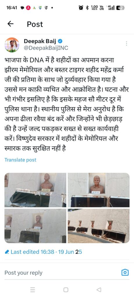 “भाजपा के DNA में है शहीदों का अपमान करना। झीरम मेमोरियल और बस्तर टाइगर शहीद महेंद्र कर्मा जी की प्रतिमा के साथ जो दुर्व्यवहार किया गया है, उससे मन काफ़ी व्यथित और आक्रोशित है।”