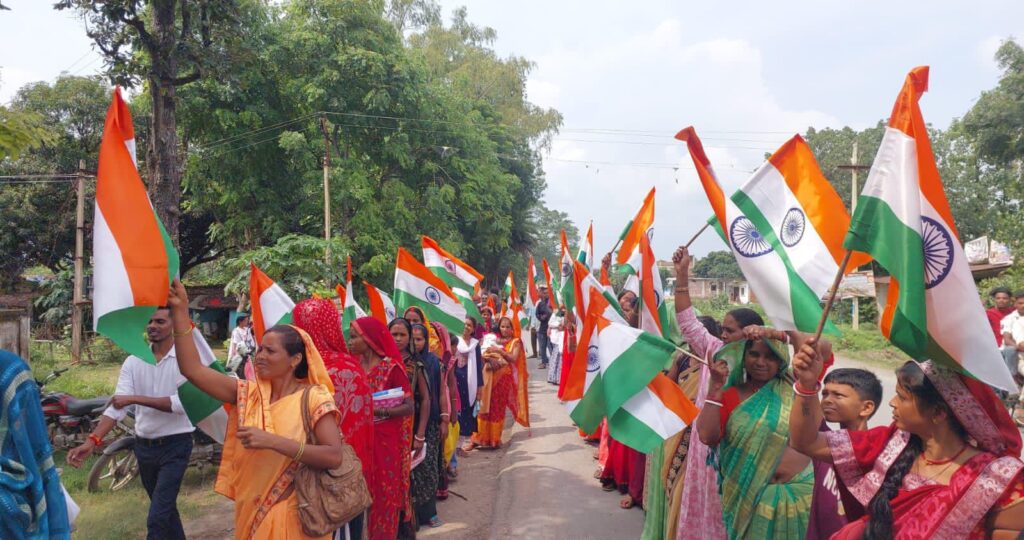 हाथों में तिरंगा लिए लोगों ने “भारत माता की जय”, “वंदे मातरम” और “तिरंगा हमारी शान है” जैसे नारे लगाए। देशभक्ति गीतों और नारों से वातावरण देशप्रेम से सराबोर हो गया।