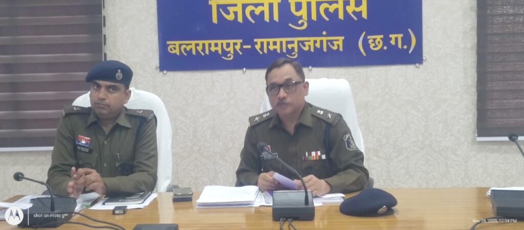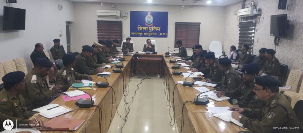 बलरामपुर-रामानुजगंज जिले में शुक्रवार, 28 नवंबर 2025 को प्रभारी पुलिस अधीक्षक मनोज कुमार खिलारी (भापुसे) ने पुलिस अधीक्षक कार्यालय के सभागार में सभी राजपत्रित अधिकारियों और थाना–चौकी प्रभारियों की अपराध समीक्षा बैठक ली। बैठक में जिले के विभिन्न थानों में लंबित अपराध, लंबित मर्ग, लंबित चालान और शिकायतों की विस्तृत समीक्षा की गई।