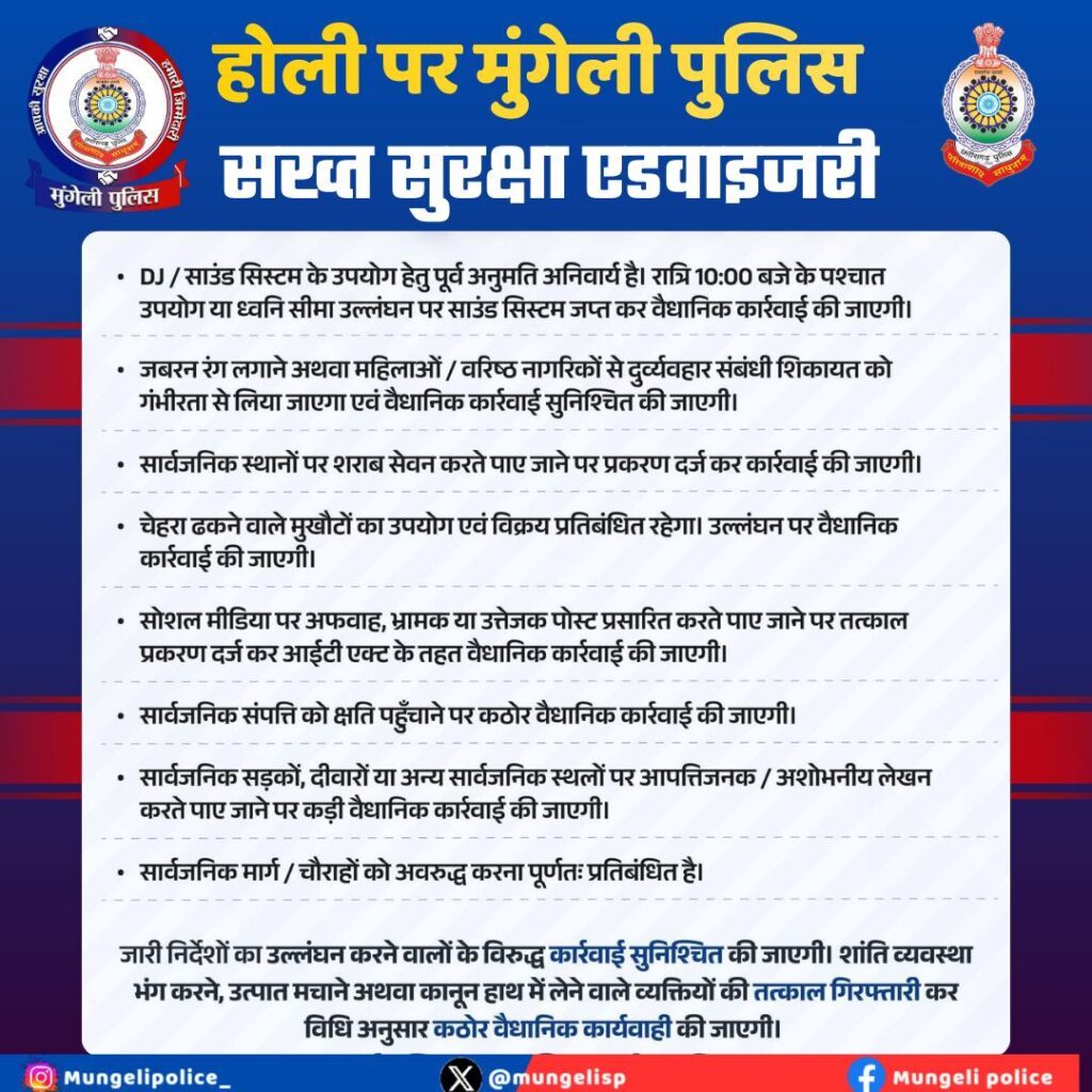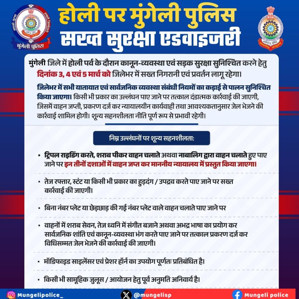 मुंगेली। होली पर्व के दौरान शांति एवं कानून-व्यवस्था बनाए रखने के लिए पुलिस अधीक्षक कार्यालय, जिला मुंगेली द्वारा सख्त सुरक्षा एडवाइजरी जारी की गई है। वरिष्ठ पुलिस अधीक्षक भोजराम पटेल के निर्देशन में 3, 4 और 5 मार्च को जिलेभर में विशेष निगरानी अभियान चलाया जाएगा। नियमों के उल्लंघन पर शून्य सहनशीलता की नीति अपनाई जाएगी।