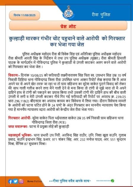 रीवा। पुलिस ने कुल्हाड़ी से गंभीर चोट पहुंचाने वाले आरोपी को गिरफ्तार कर जेल भेज दिया है। घटना 10 अगस्त 2025 की है, जब फरियादी लक्ष्मीनारायण सिंह (70) निवासी डिहिया, थाना गोविंदगढ़, अपने खेत पर पहुंचे। वहां आरोपी सुरेश साकेत ने खेत में तुड़ाई करने को लेकर विवाद किया और गाली-गलौज करते हुए कुल्हाड़ी से हमला कर दिया।