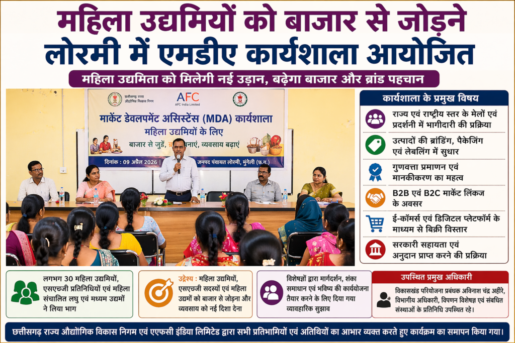 मुंगेली// विकासखंड लोरमी में महिला उद्यमियों को सशक्त बनाने के उद्देश्य से 09 अप्रैल को मार्केट डेवलपमेंट असिस्टेंस (एमडीए) कार्यशाला आयोजित की गई।