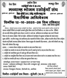 मुंगेली, 11 अक्टूबर 2025 — मध्याह्न भोजन रसोइया संघ जिला मुंगेली (छ.ग.) से संबद्ध भारतीय मजदूर संघ का त्रैवार्षिक अधिवेशन आगामी 12 अक्टूबर 2025, रविवार को आयोजित किया जाएगा। यह कार्यक्रम मंडी परिसर मुंगेली में रखा गया है, जिसमें जिलेभर की सभी रसोइया दीदी एवं भाई बड़ी संख्या में शामिल होंगे।