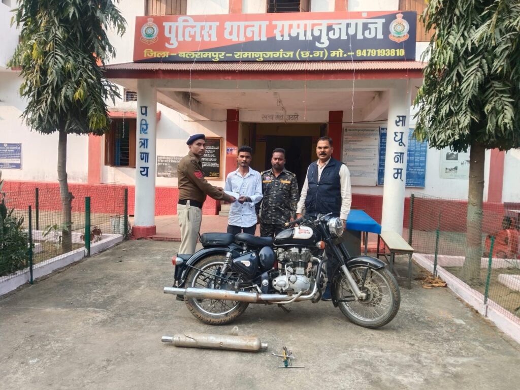 पुलिस द्वारा बुलेट मोटरसाइकिल क्रमांक JH 03 P 2022 के चालक मोहम्मद अंसार, पिता असलम अंसारी, उम्र 42 वर्ष, निवासी वार्ड क्रमांक 8 रामानुजगंज को मॉडिफाइड साइलेंसर लगाकर वाहन चलाते हुए पाया गया।