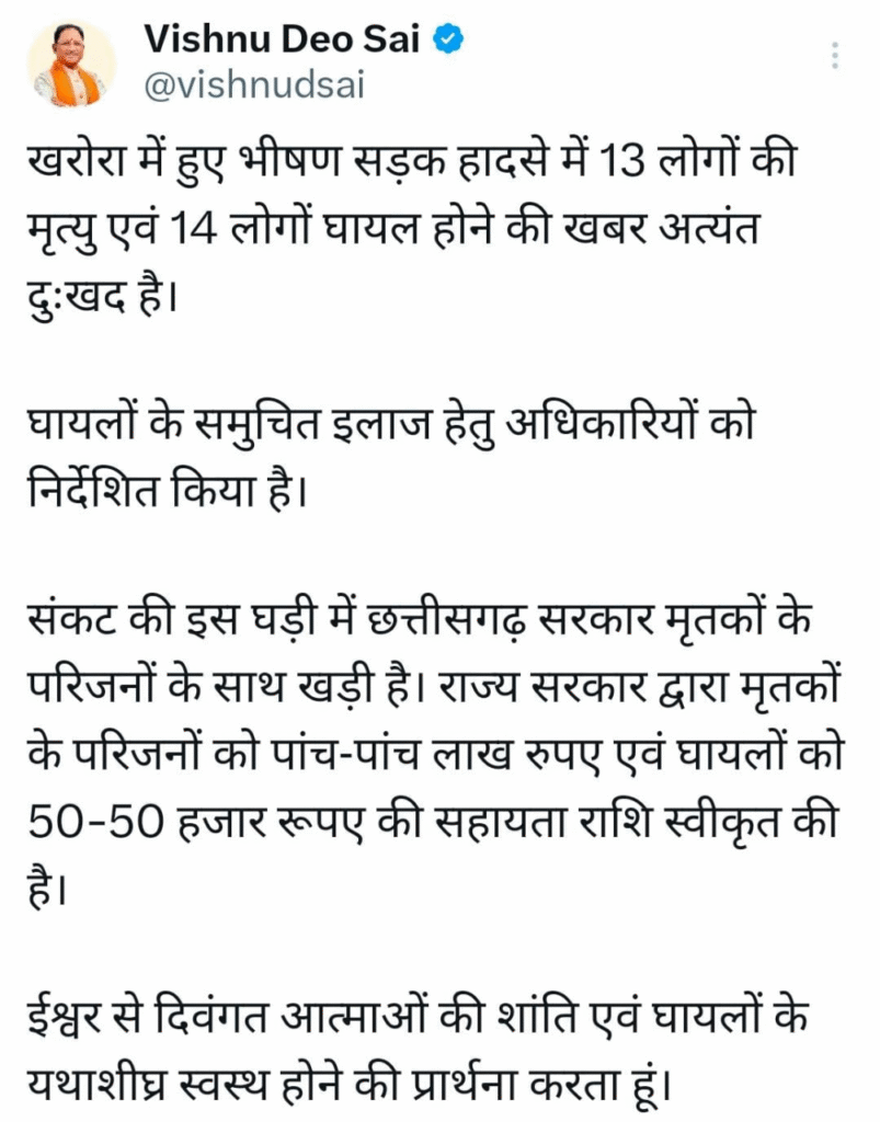 खरोरा सड़क दुर्घटना पर मुख्यमंत्री श्री विष्णु देव साय ने गहरा शोक व्यक्त किया
