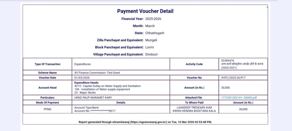 ग्रामीण खेमेश्वर पुरी गोस्वामी ने इस पूरे मामले की लिखित शिकायत जिला कलेक्टर से की है। शिकायत में बताया गया है कि 5 फरवरी 2026 को सरपंच पति ने मरम्मत के नाम पर हैंडपंप का सबमर्सिबल पंप निकलवाया था। इसके बाद सचिव के साथ कथित मिलीभगत कर मरम्मत के नाम पर सरकारी खाते से दो किश्तों में लगभग 70 हजार रुपये निकाल लिए गए—जनवरी में लगभग 40 हजार रुपये और 1 मार्च को 30 हजार रुपये।