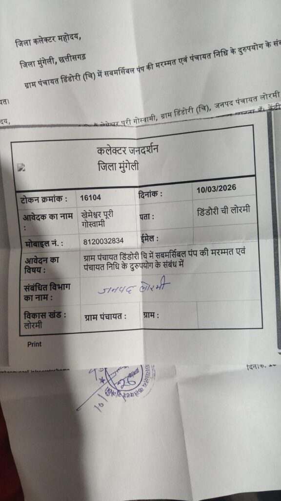 जब जनप्रतिनिधि विकास के बड़े-बड़े दावे करते हैं और मंचों से ग्रामीण विकास की गाथा सुनाते हैं, तब जमीनी हकीकत कई बार उन दावों की पोल खोल देती है। विडंबना यह है कि जिन जनप्रतिनिधियों को जनता ने अपने अधिकारों और सुविधाओं की रक्षा के लिए चुना, वही सत्ता की छांव में भ्रष्टाचार के आरोपों से घिरते नजर आते हैं। लोरमी क्षेत्र के ग्राम पंचायत डिंडोरी (चि) का मामला भी कुछ ऐसा ही है, जहां सत्ता के प्रभावशाली गलियारों के बीच बसे गांव के लोग आज भी एक-एक बूंद पानी के लिए तरस रहे हैं, जबकि सरकारी कागजों में हैंडपंप की मरम्मत पूरी हो चुकी है और राशि भी आहरित कर ली गई है।