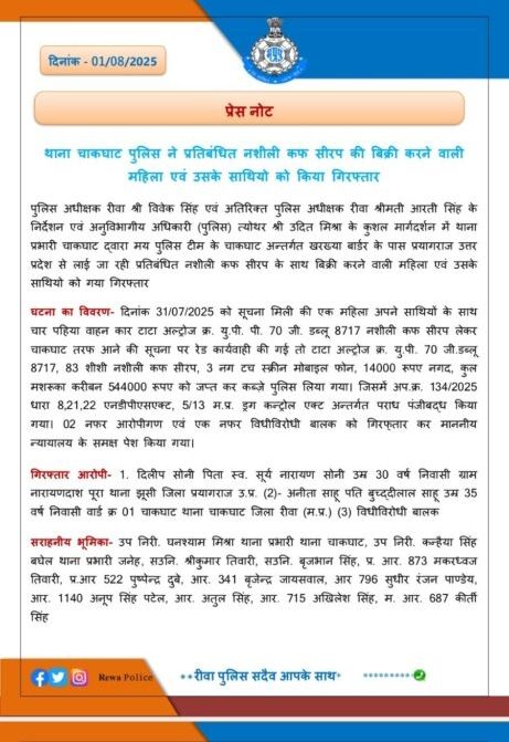 रीवा, 01 अगस्त 2025 — थाना चाकघाट पुलिस ने एक बड़ी कार्रवाई करते हुए प्रतिबंधित नशीली कफ सिरप की तस्करी में लिप्त एक महिला और उसके साथी को गिरफ्तार किया है। पुलिस को सूचना मिली थी कि उत्तर प्रदेश की ओर से एक टाटा एल्ट्रोज़ कार में प्रतिबंधित कफ सिरप लाया जा रहा है, जिसके आधार पर चाकघाट बॉर्डर पर टीम ने घेराबंदी कर दी।