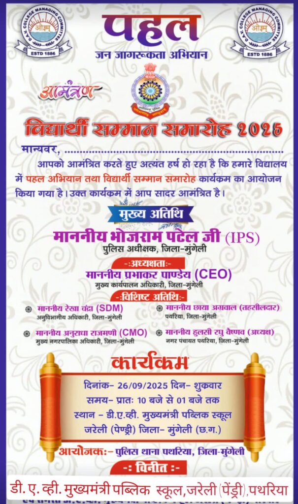 पथरिया/मुंगेली। पुलिस अधीक्षक भोजराम पटेल के मार्गदर्शन में “पहल” अभियान के अंतर्गत आज शुक्रवार 26 सितंबर 2025 को DAV पब्लिक स्कूल पथरिया में जागरूकता कार्यशाला का आयोजन किया जाएगा। यह कार्यक्रम सुबह 10 बजे से दोपहर 1 बजे तक आयोजित होगा।