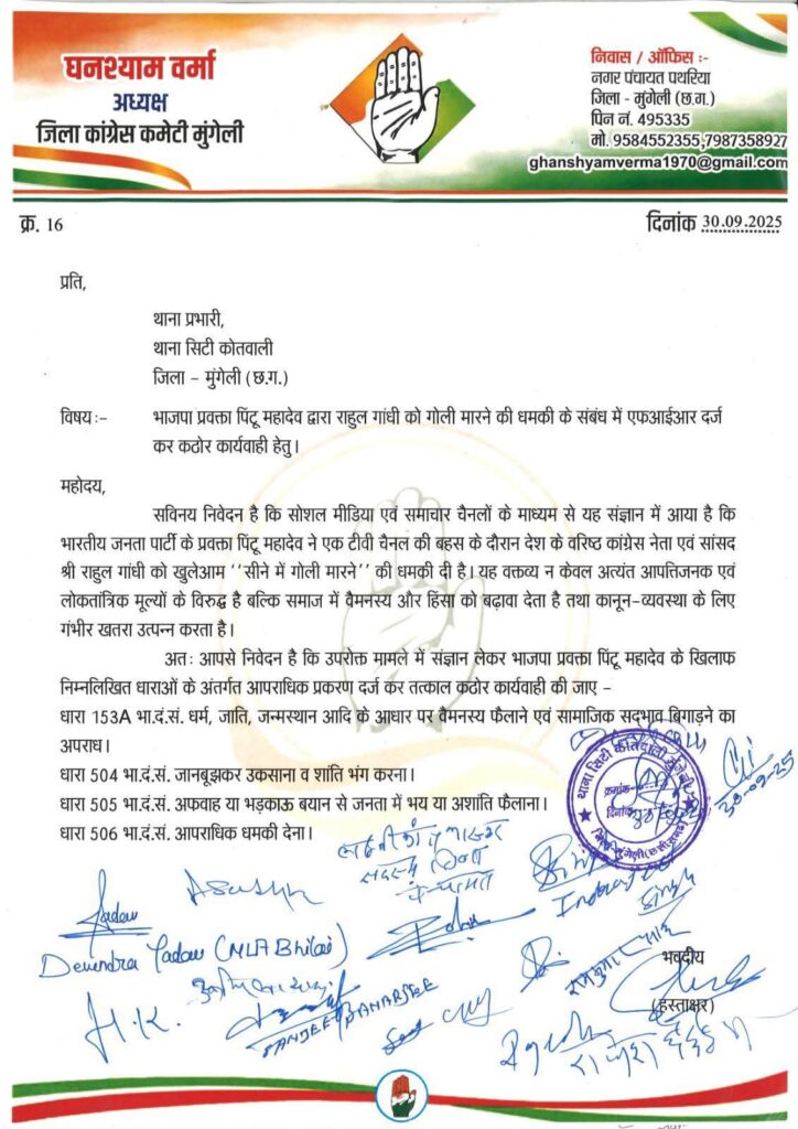 मुंगेली। भारतीय राष्ट्रीय कांग्रेस के कार्यकर्ताओं ने आज सिटी कोतवाली मुंगेली पहुंचकर भाजपा प्रवक्ता प्रिंटु महादेवा के खिलाफ एफआईआर दर्ज करने की मांग की। कांग्रेस का आरोप है कि उन्होंने लोकसभा में नेता प्रतिपक्ष राहुल गांधी को लाइव चैनल पर सीने में गोली मारने की धमकी दी थी।