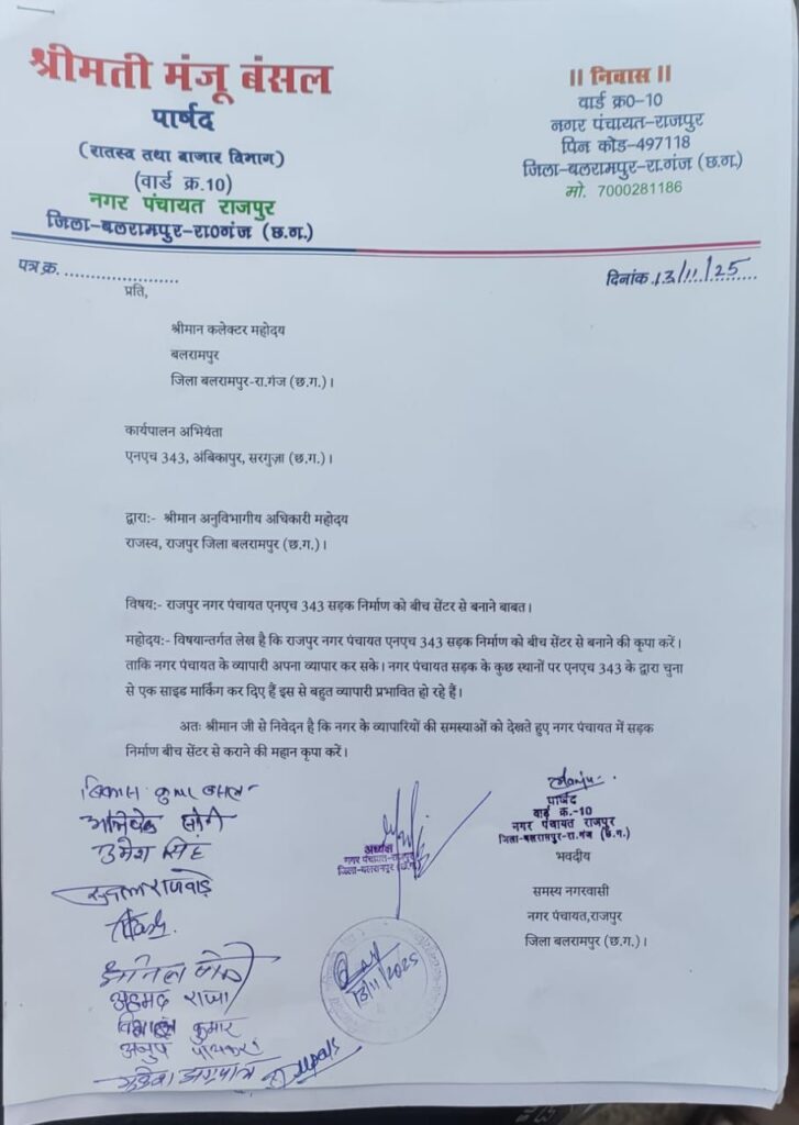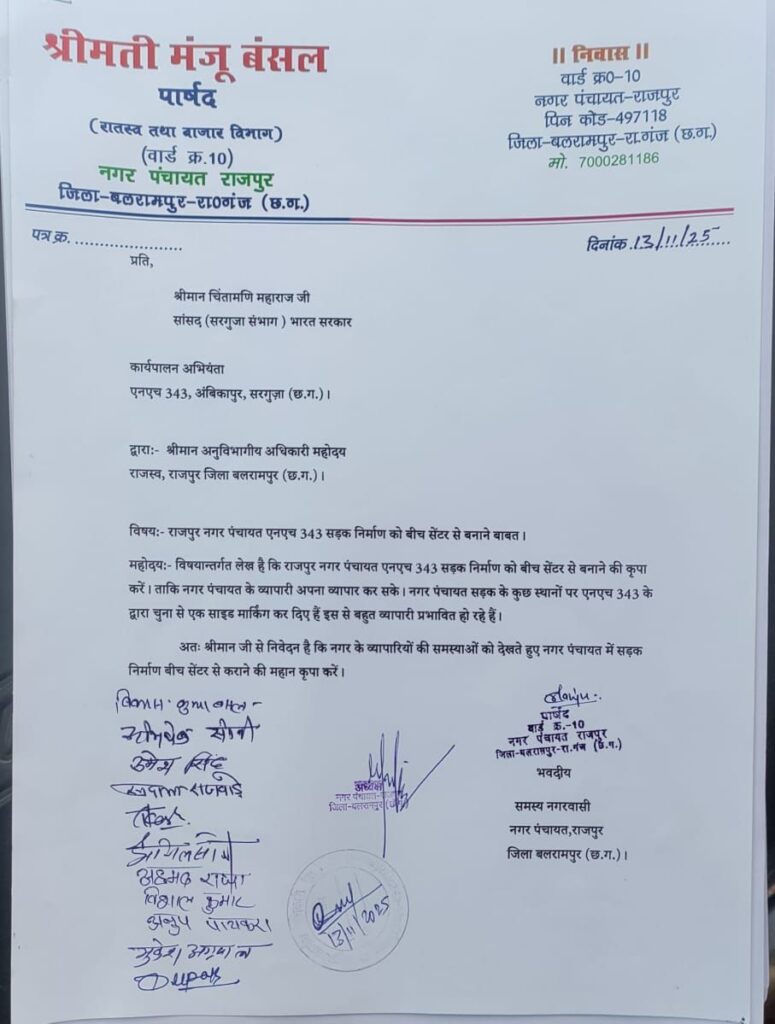 बलरामपुर/राजपुर। राजपुर नगर पंचायत क्षेत्र में एनएच-343 सड़क को बीच सेंटर से बनाने की मांग को लेकर नगरवासियों ने सरगुजा सांसद चिंतामणि महाराज, बलरामपुर कलेक्टर राजेंद्र कुमार कटारा और सरगुजा एनएच-343 के कार्यपालन अभियंता के नाम ज्ञापन सौंपा। ज्ञापन एसडीएम देवेंद्र कुमार प्रधान को सौंपा गया।