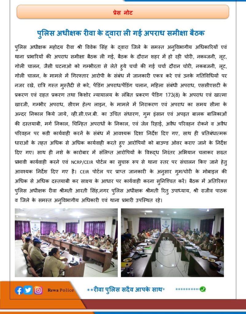 बैठक में अतिरिक्त पुलिस अधीक्षक हितेंद्र सिंह, नगर पुलिस अधीक्षक रित्व उपाध्याय, राजीव पाठक सहित जिले के समस्त अनुविभागीय अधिकारी एवं थाना प्रभारी उपस्थित रहे