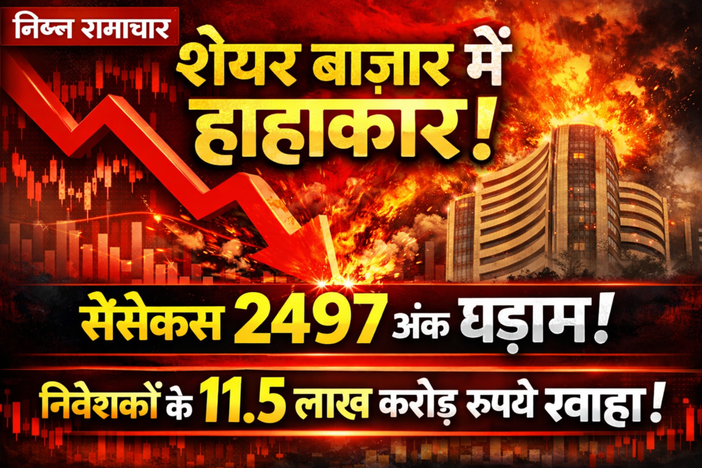 लगातार तीन दिनों की तेजी के बाद गुरुवार (19 मार्च 2026) को भारतीय शेयर बाजार में ‘ब्लैक थर्सडे’ (Black Thursday) देखने को मिला। ग्लोबल मार्केट के दबाव, मध्य पूर्व में बढ़ते भू-राजनीतिक तनाव और कच्चे तेल की कीमतों में आए अचानक उछाल ने बाजार को बुरी तरह झकझोर दिया। प्रमुख सूचकांक सेंसेक्स और निफ्टी दोनों में 3% से अधिक की भारी गिरावट दर्ज की गई, जिससे चंद घंटों में निवेशकों के करीब 11.5 लाख करोड़ रुपये डूब गए।