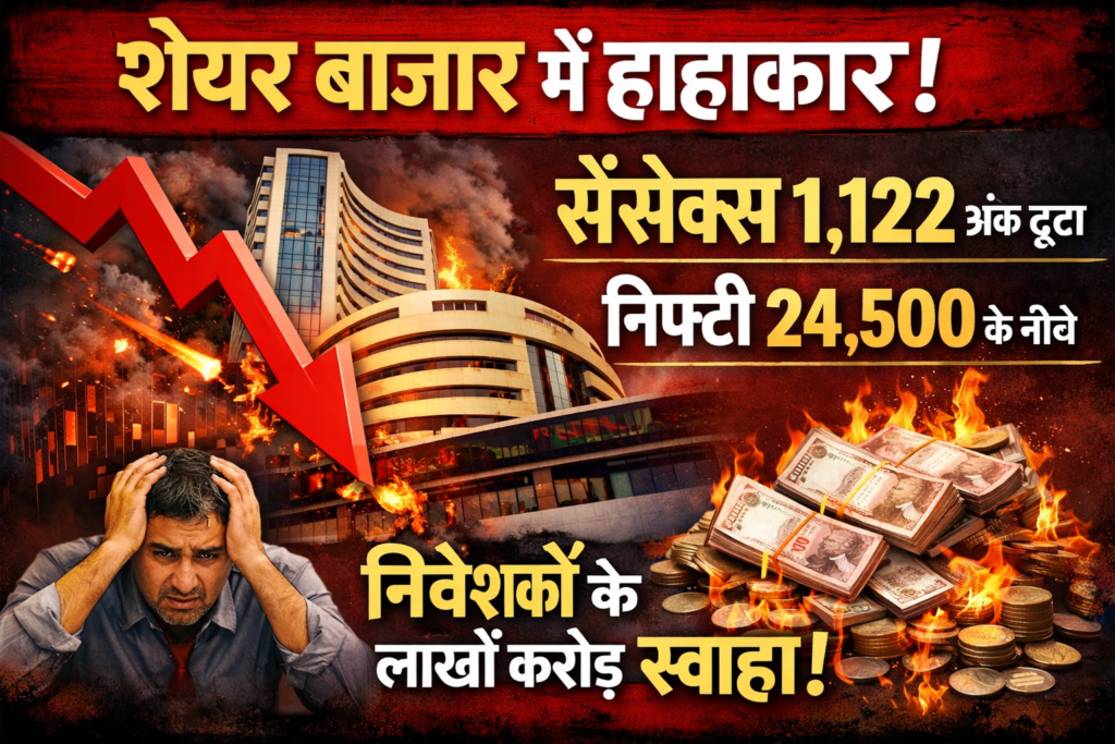 4 मार्च 2026| भारतीय शेयर बाजार में आज लगातार चौथे दिन भारी गिरावट (ब्लडबाथ) देखने को मिली। पश्चिम एशिया में बढ़ते भू-राजनीतिक तनाव और कच्चे तेल (Crude Oil) की आसमान छूती कीमतों ने आज दलाल स्ट्रीट पर निवेशकों को घुटनों पर ला दिया। बाजार में चौतरफा बिकवाली का दबाव रहा, जिससे निवेशकों की भारी संपत्ति का नुकसान हुआ है।