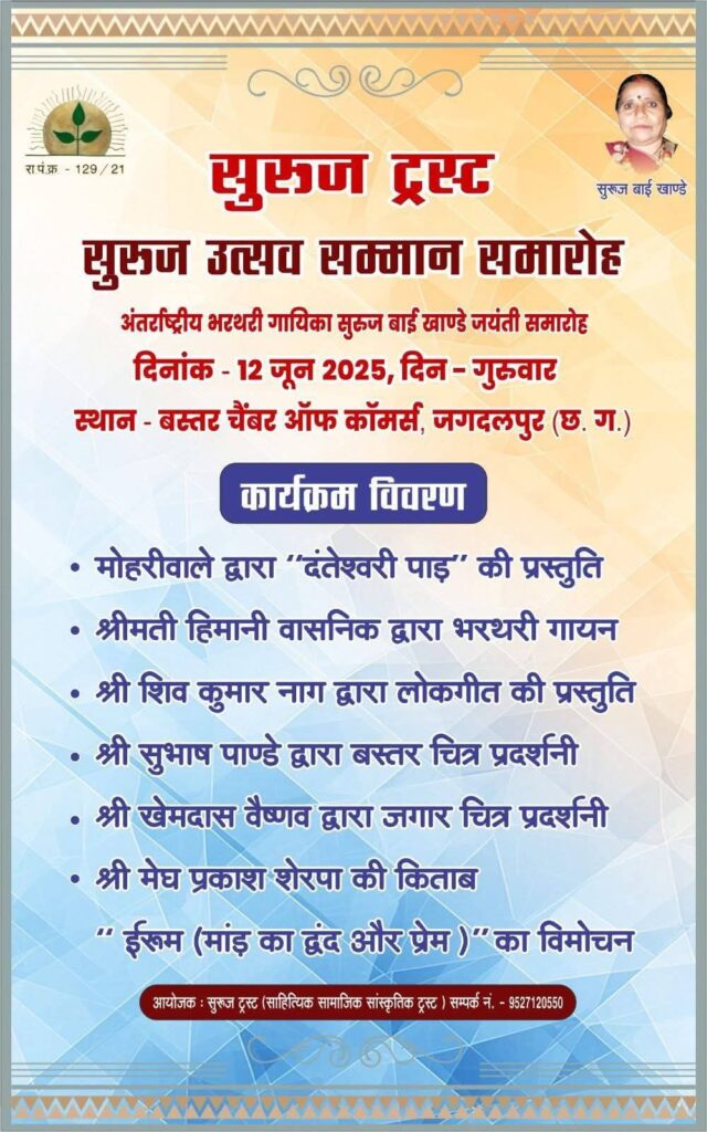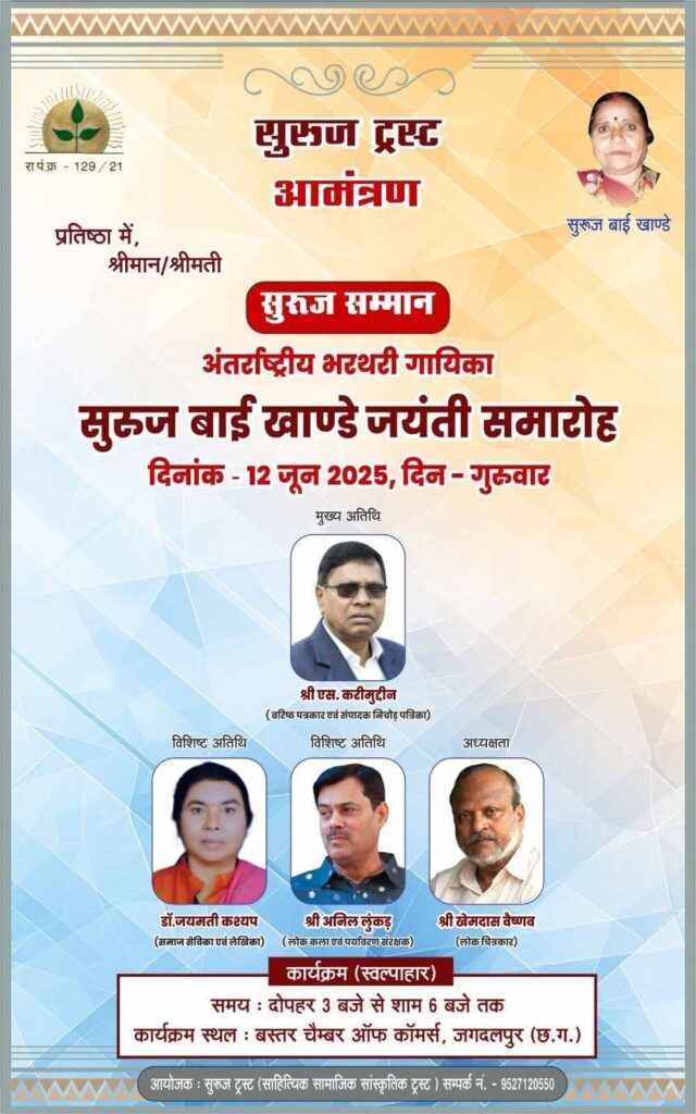 जगदलपुर, 12 जून 2025 – अंतरराष्ट्रीय भरथरी गायिका सुरज बाई खाण्डे की जयंती के अवसर पर साहित्यिक सामाजिक सांस्कृतिक संस्था सुरज ट्रस्ट के तत्वावधान में “सुरज उत्सव सम्मान समारोह” का आयोजन किया गया। यह समारोह बस्तर चैंबर ऑफ कॉमर्स, जगदलपुर (छत्तीसगढ़) में आयोजित होगा, जिसमें क्षेत्रीय कला, संस्कृति और साहित्य से जुड़ी विशिष्ट हस्तिया भाग लेंगे ।