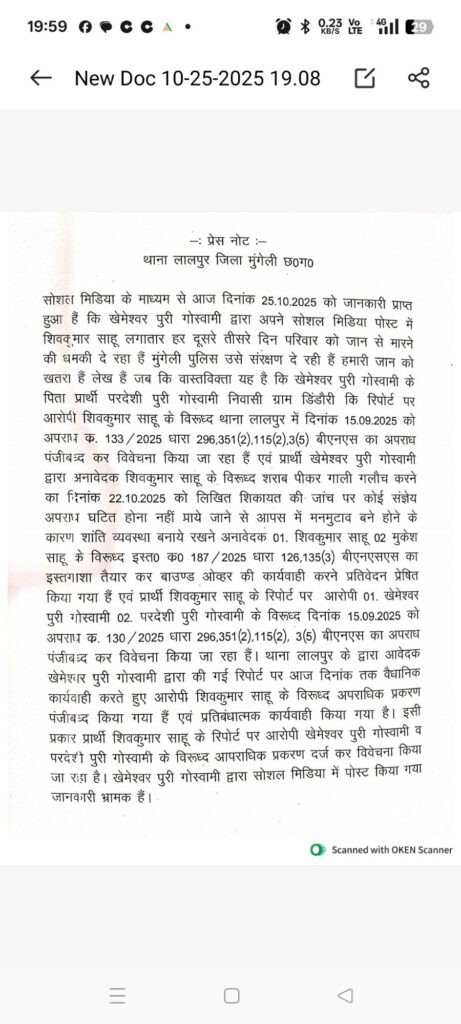 वास्तविकता यह है कि खेमेश्वर पुरी गोस्वामी के पिता परदेशी पुरी गोस्वामी की रिपोर्ट पर शिवकुमार साहू के खिलाफ थाना ललपुर में 15 सितंबर 2025 को अपराध क्रमांक 133/2025 धारा 296, 351(2), 115(2), 3(5) BNS के तहत मामला दर्ज कर विवेचना की जा रही थी। वहीं, शिवकुमार साहू द्वारा भी खेमेश्वर पुरी गोस्वामी और परदेशी पुरी गोस्वामी के खिलाफ रिपोर्ट दर्ज कराई गई थी, जिस पर पुलिस ने विधिवत जांच कर कार्रवाई की।