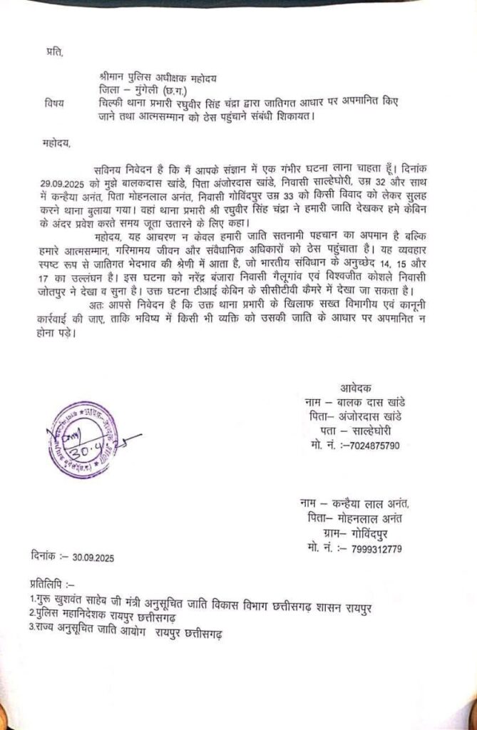 मुंगेली, 30 सितम्बर 2025// जिले के साल्हे घोरी निवासी बालकदास खांड़े और गोविंदपुर निवासी कन्हैया लाल अनंत ने पुलिस अधीक्षक मुंगेली को शिकायत पत्र सौंपकर चिल्फी थाने में पदस्थ प्रभारी रघुवीर सिंह चंद्रा पर गंभीर आरोप लगाए हैं।